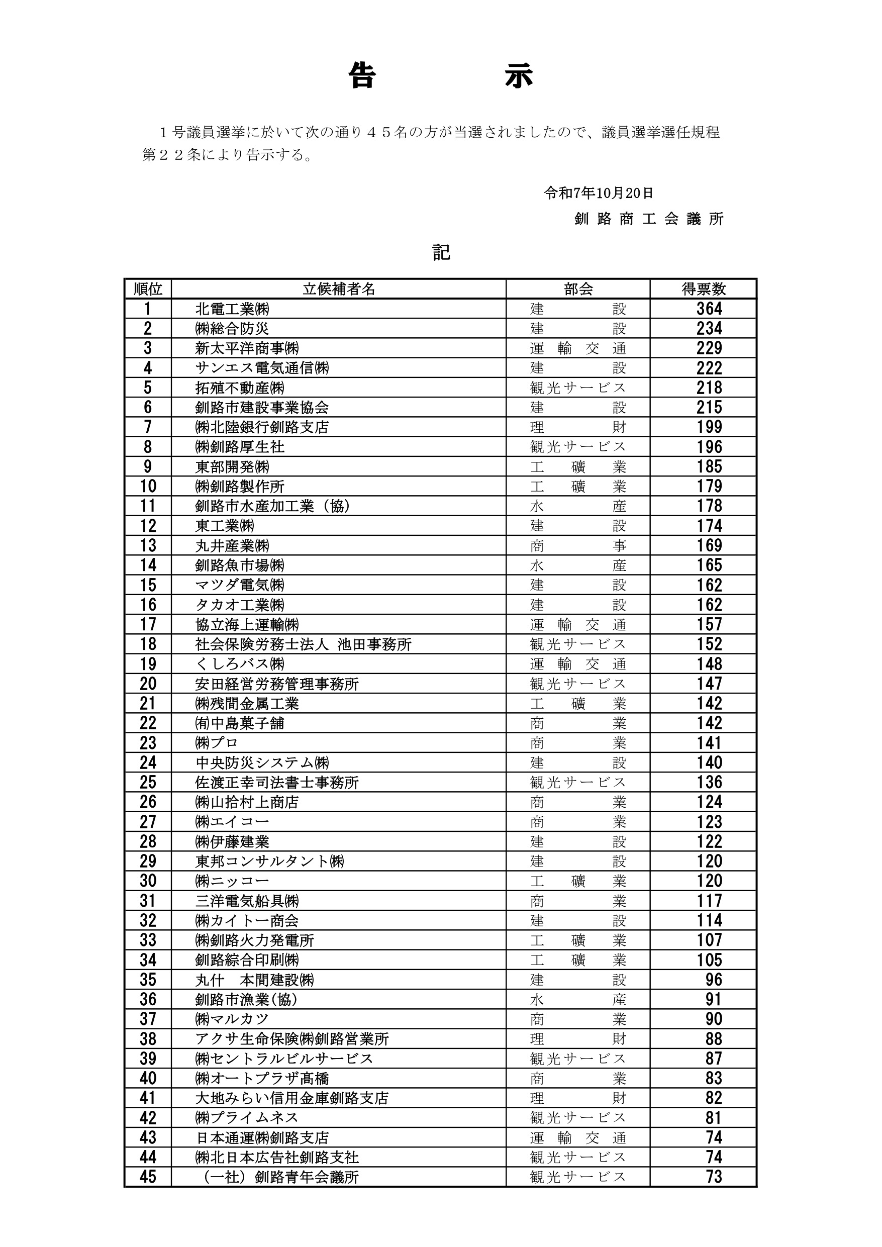 1号議員(45名)の選挙結果について 釧路商工会議所1号議員選挙は、令和7年10月20日(月)に投票が行われ、即日開票の結果、下記の通り45名の方が当選されました。 ※得票同数の順位について 当所議員選挙選任規定第2章第5節第20条 ”得票同数の者の順位は抽せんによって決定する。” となっていることから、得票同数の順位については事前の抽選によって決定しております。 ツイート