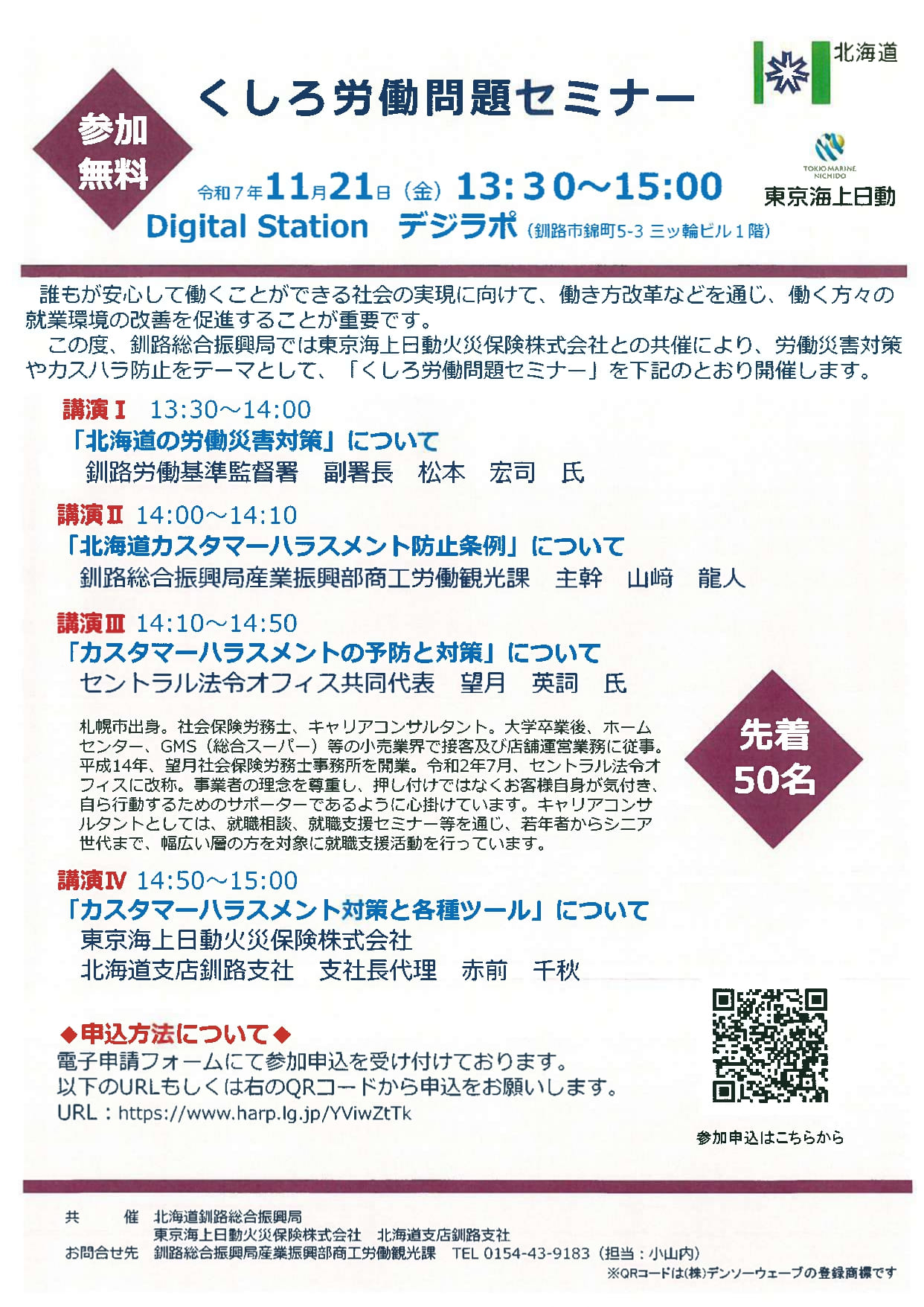この度、釧路総合振興局では、東京海上日動火災保険株式会社との共催により、労働災害対策やカスハラ防止をテーマとして『くしろ労働問題セミナー』を下記のとおり開催します。