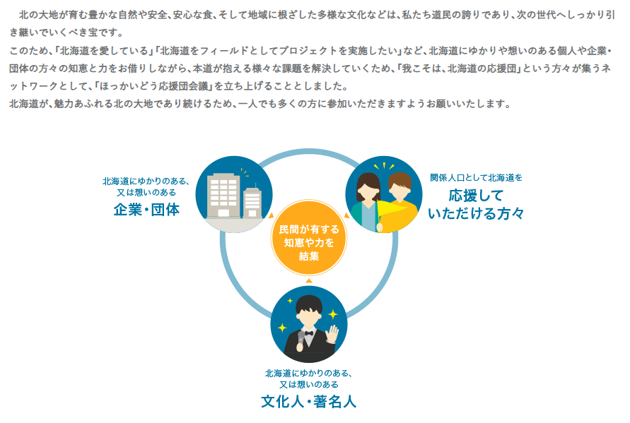 北海道庁 総合政策部 官民連携推進局から、「ほっかいどう応援団会議」参加について案内がありましたので、連絡します。