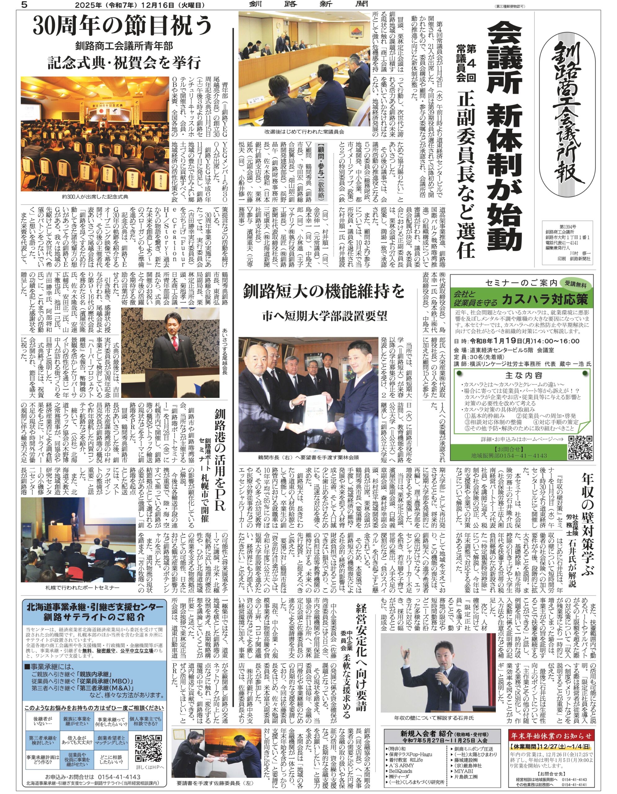 令和7年12月16日号(No.1394) 12月16日号 🔍クリックで拡大します □■□■ 主な内容 □■□■ ①第4回常議員会 ②釧路市へ短期大学部設置要望 ③釧路YEG30周年記念式典 ④釧路港ポートセミナー ⑤年収の壁セミナー ⑥中小企業委員会 年末金融要請